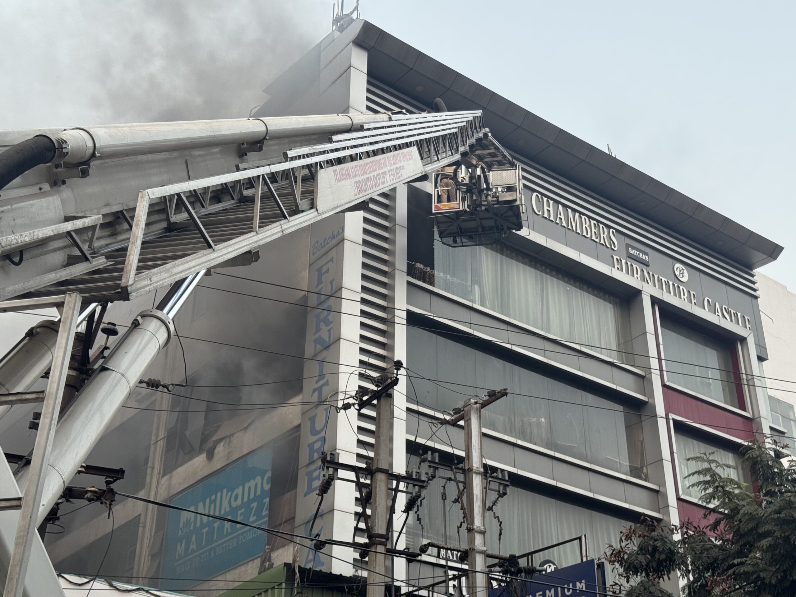 __Hyderabad mein ek furniture godown mein khareeb 4 ghante se shadeed aag lagi hui hai. Samne ke glass badi der tak nahi tode gaye, jabke yeh kaam pehle hi mumkin tha. Ab aakhirkar front side ka glass toda ja raha hai. Andar khareeb 10 log phanse hone ka andesha bataya ja raha hai. Hyderabad Collector aur Police Commissioner mauqe par maujood hain aur rescue operation ki khud nigraani kar rahe hain. Filhaal andar phanse afraad ki salamati ke liye dua ki ja rahi hai.